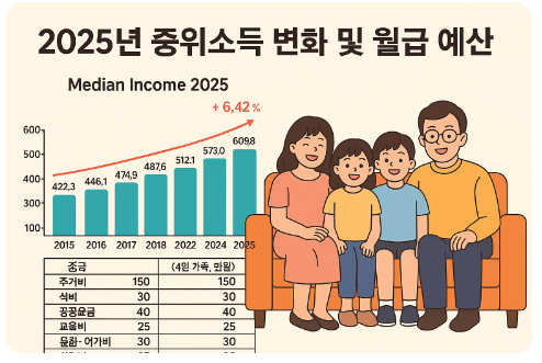 ✅ 2025년 한국 4인 가구 중위소득은 월 609.8만원으로 역대 최고 기록 중.