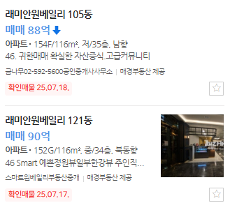 아래 캡처한 사진의 105동 저층 물건은 7월 22일 7억 원을 하향 조정한 물건으로, 최근 원베일리는 과도하게 호가를 높게 불렀다가 약 10%씩 호가를 조정하는 모습이 나타나고 있다.