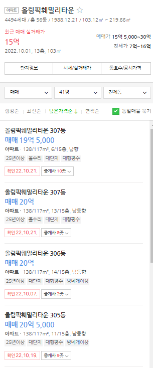네이버 부동산 상의 호가 역시 비슷한 층수 물건이 15.5억에 나와 있는 것을 보면 이번 15억 거래가 급급매 물건이었던 것을 알 수 있다.