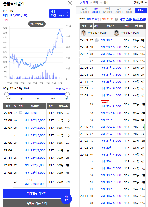 21년 8월 23.8억까지 거래되었던 43평형 물건은 22년 9월 18억까지 하락했다. 약 25% 정도 하락한 것으로 32평 물건과 비슷한 하락률을 보이고 있다.