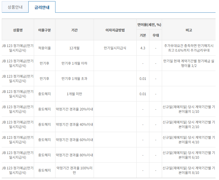 일단 기본 이율은 4.3프로이고, 여기에 가입하기 전에 1년 동안 전북은행에 원화정기예금을 보유하지 않은 경우 0.7%, 개인정보 동의할 경우 0.1%를 추가로 받아 5.1%의 금리를 받을 수 있습니다.