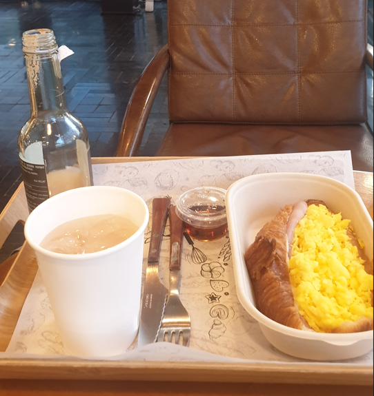 아래 사진은 크라상 장봉. 크라상에 장봉(프랑스식 햄)과 스크램블드 에그를 넣은 것이다. 바삭바삭하고 포근포근한 맛이 일품이지만, 이날 먹었던 것은 크라상이 좀 눅눅했다. 곁들여 먹은 것은 사과 주스. 사과 주스도 프랑스에서 만든 것인데, 착즙 주스라 그런지 우리나라 슈퍼에서 먹는 것보다 더 진하고 뭔가 묵직한 맛이 있었다.
