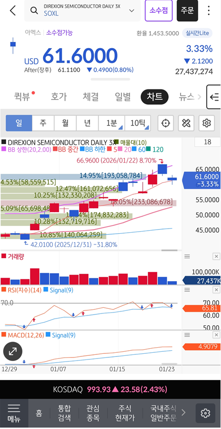 삼성전자의 역대급 실적 전망과 현대차의 로봇 신사업 등 대형주들의 긍정적인 행보는 반도체 섹터 전체의 투심을 살리고 있습니다. 하지만 SOXL은 변동성이 크다는 점을 절대 잊어서는 안 됩니다.