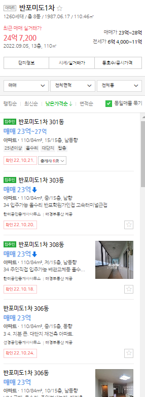 네이버 부동산에 따르면 현재 저층은 물론, 중층, 15층 등 로열층 물건도 23억에 나와 있다. 최고가인 28억에 비해 이미 호가는 5억이나 빠진 것으로 약 18%의 하락을 보이고 있다고 할 수 있다. 때문에 다음 거래는 23억에 실행될 가능성이 높으며, 그 때부터 미도1차는 거의 20%에 달하는 조정을 보이게 된다.