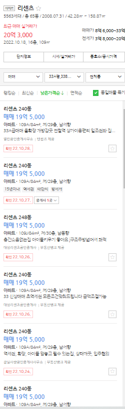 잠실 리센츠 33평형은 10월 4일 시세 분석을 할 때까지만 해도 최저 실거래가가 22억이었으며, 최저 호가는 20억으로 아직 20억대가 깨지지는 않았다.