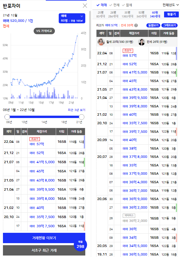 60평형은 18년까지 20억대 중반을 유지했으나, 이후 급상승해서 22년 4월 57억(12층)까지 상승했다. 마찬가지로 거의 3배 가까이 오른 것이다.