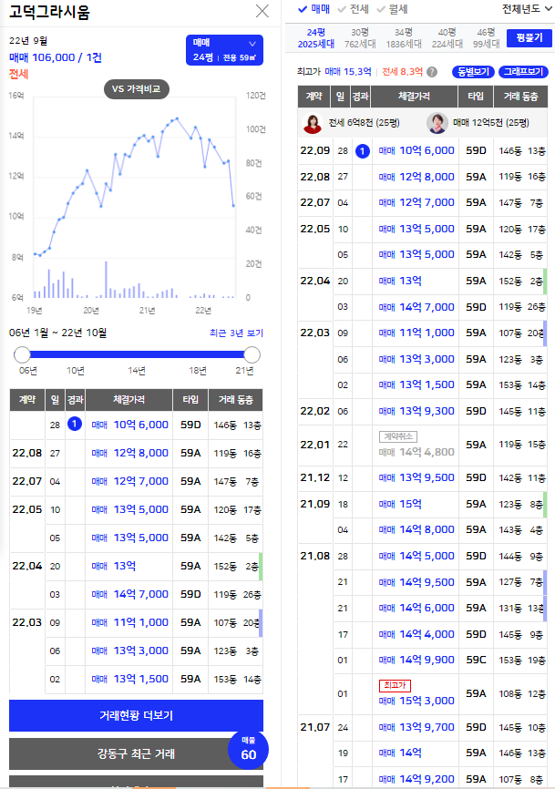 그 후로 가격이 하락하기 시작해 22년 9월에는 최저인 10.6억까지 빠졌다. 최고가 대비 31%이나 빠진 것이다.