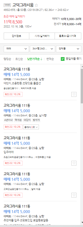 이후 호가는 더욱 하락해 현재 중층 물건이 14.5억에 나와 있다. 현재 28%까지 하락한 것으로, 20년대 하반기 가격까지 회복된 것이다.