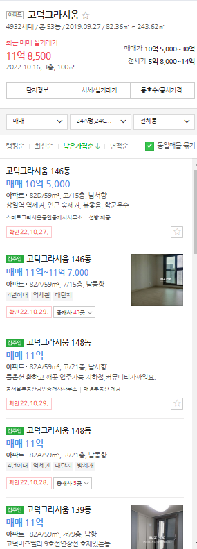 현재 호가는 조금 더 하락한 10.5억이다. 고층 물건이 최저 호가를 형성하고 있어 실질적으로 가격이 1달 전에 비해 수 천 이상 하락한 것이다.