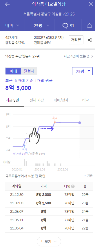 가장 세대수가 많은 23평형은 21년 9월과 12월 8.3억까지 거래된 후 올해 거래된 기록이 없다.