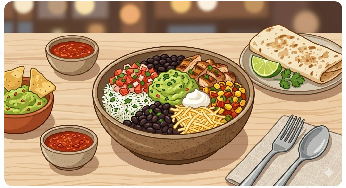 - 부리또 보울 (Burrito Bowl): 부리또의 재료를 토르티야 없이 그릇에 담아 제공하는 메뉴입니다. 토르티야 탄수화물을 줄이고 싶거나 숟가락으로 편하게 비벼 먹고 싶은 사람들에게 인기가 많습니다.