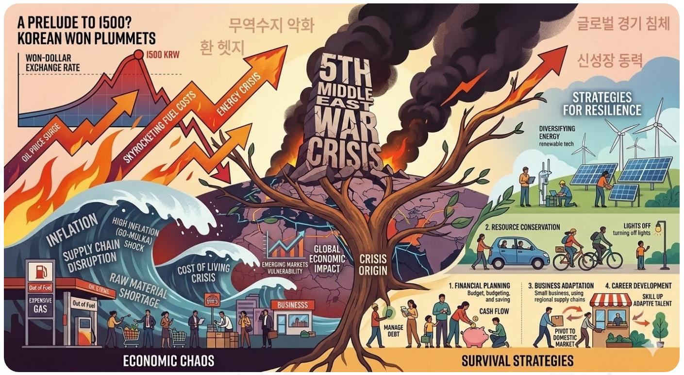 2026년 봄, 대한민국 경제에 다시 한번 빨간불이 켜졌습니다. 평온하던 외환시장이 중동발 전쟁 위기라는 거대한 파고를 만나며 요동치고 있기 때문입니다. 특히 원달러 환율이 심리적 저항선인 1500원을 돌파했다는 소식은 수출입 기업은 물론 일반 가계에도 커다란 충격을 주고 있습니다. 국제 유가가 꿈틀대며 에너지 비용 상승 압박이 거세지는 가운데, 환율마저 고공행진을 이어가면서 이른바 고유가와 고환율이라는 쌍두마차 폭풍이 몰아치고 있습니다. 오늘 블로그에서는 중동 전쟁의 전개 양상에 따른 향후 환율 전망을 다각도로 분석하고, 이러한 초고환율 시대에 우리가 준비해야 할 생존 전략은 무엇인지 심층적으로 살펴보겠습니다.