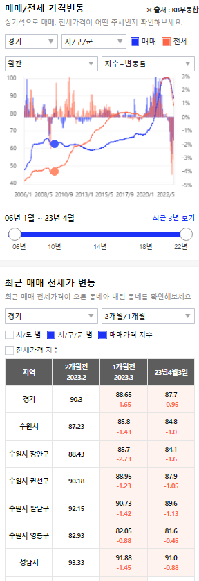 월단위로 보자면 경기도 평균 가격은 2월 대비 3월에 -1.65, 4월에 -.95로 계속 하락해, 하락폭이 서울보다 크다.