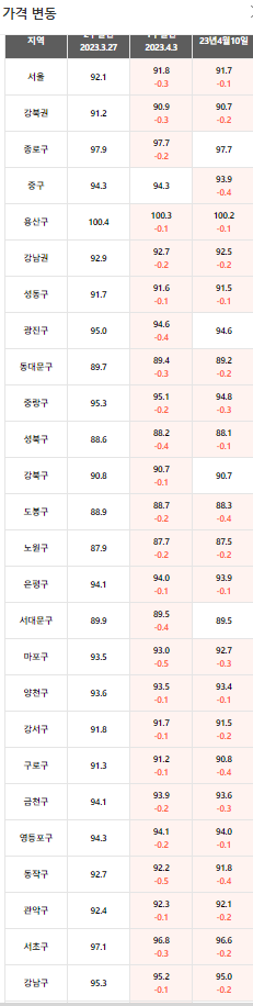 3월 27일 주에 비해 4월 10일 주 하락폭이 -0.1로 줄었습니다. 4월 3일 주에 1주일만에 -0.3이 하락했던 것에 비하면 하락폭이 줄어든 것입니다.