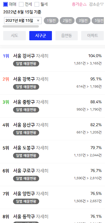 1년 전 매도 물량에 비해 지금은 어떤 상황일까? 아실 자료에 의하면 전국적으로 매도 물량이 폭증했다. 서울에서 매도 물량이 가장 많이 늘어난 곳은 강서구, 강북구, 중랑구, 용산구, 도봉구 순이다. 특히 강서구는 작년 이맘 때 1,551건이 매도 시장에 나와 있었으나 지금은 3,165건이 나와 있다. 매도자가 폭증하면서 매수자 우위 시장이 된 상황이다.