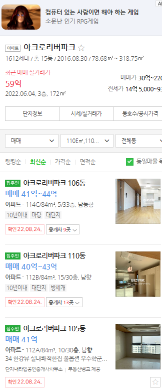 우리나라 최고가 아파트로 유명한 아크로리버파크를 보자. 112B형은 2022년 1월에 46.6억(8층)에 거래되었는데, 2021년 12월(8층)에 비해 약 6억이 오른 가격이다. 현재 호가를 보면 40-50억으로 가격 범위가 넓은데, 대략 40억대 초중반에 가격이 형성되어 있는 것을 볼 수 있다. 특히 40억은 한강조망이 불가능한 저층 물건임을 감안하면, 호가가 직전 실거래가 대비 6억이 빠졌다는 기사는 물건의 여러 특징을 고려하지 않은 것이라 볼 수 있다. 40대 초반 물건 중 한강뷰라고 적힌 물건이 있긴 하지만 막상 네이버에 올린 물건의 내부 사진을 보면 한강 조망이 되지 않거나, 아주 작게 보여서 사실상 소위 한강 '뻥뷰'와는 거리가 멀다. 해서 이 물건은 기사만큼 급락한 호가가 나와 있다고 보기는 어렵다.