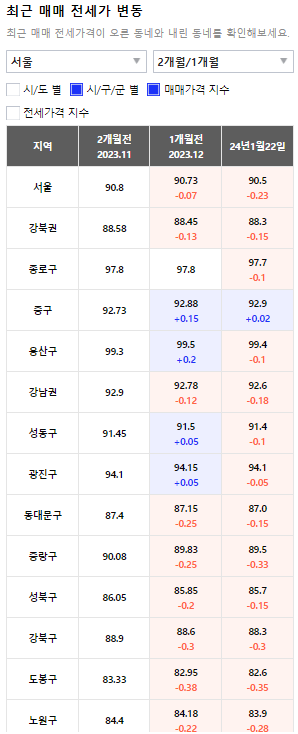 서울 아파트 매매 가격 변동은 2024년 1월 8일에 비해 1월 15일 0.00, 1월 22일에는 -0.1로 하락 반전되었다. 강남권은 -0.1에서 0.0으로, 강북권은 0.00에서 0.00으로 약한 하락 추세를 보이고 있다.