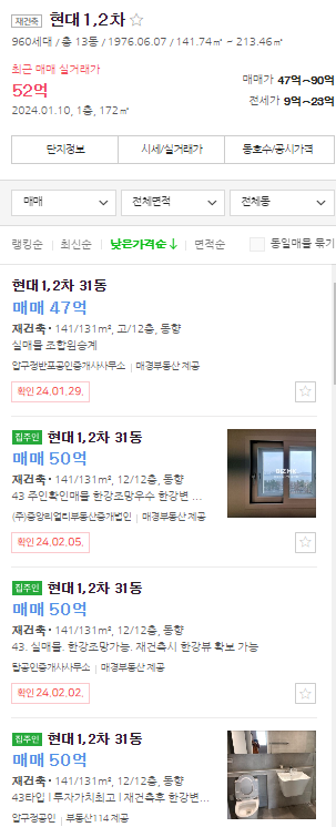 현재 최저가로 나온 물건은 37억으로 31동 고층 물건이다. 그 외에는 50억에서 51억 사이에 시세가 형성되어 있다. 즉 2022년 6월 최고가보다 3억 정도 더 오른 가격이다.
