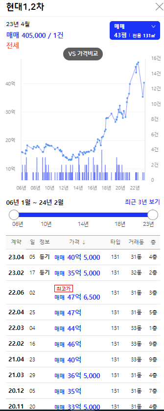 아래 표를 보면 2006년 현대 1,2차 43평형은 2006년도에 15억을 기록했다. 2010년 전후로 20억까지 30% 정도 상승했으나, 2013년도에 13억대까지 하락했다. 즉 3년 사이에 약 35% 정도 하락한 것이다.