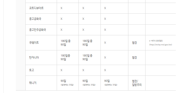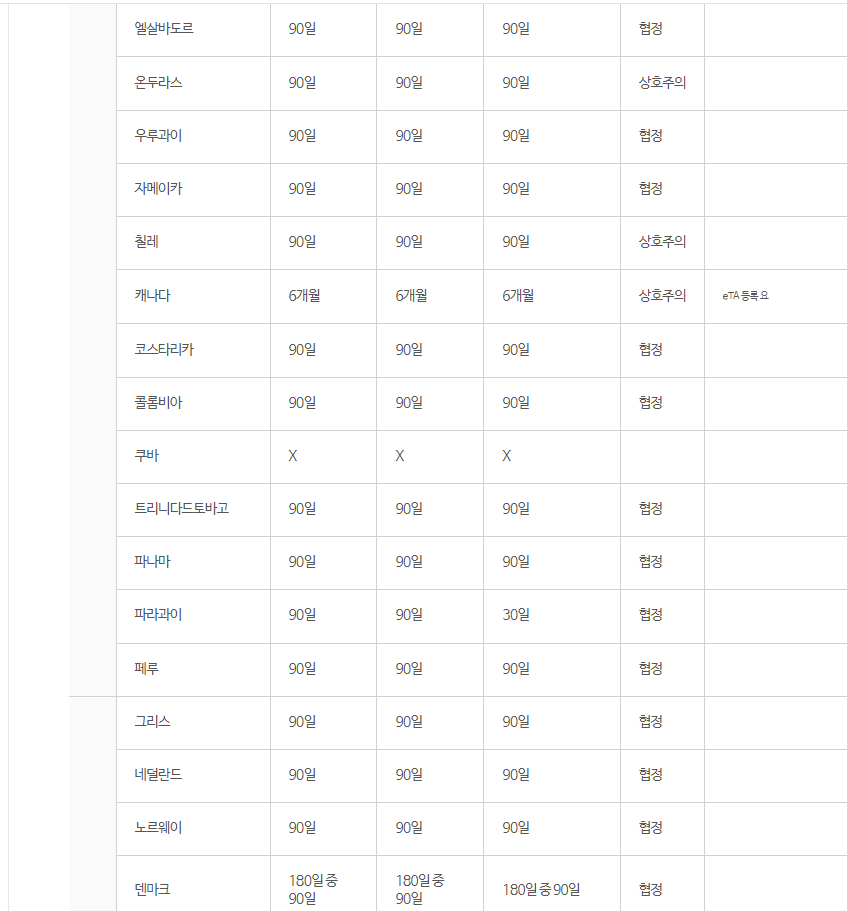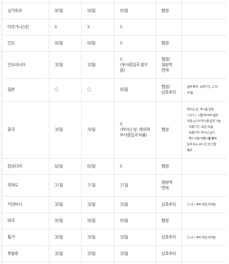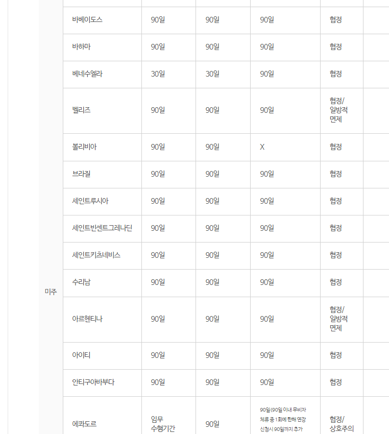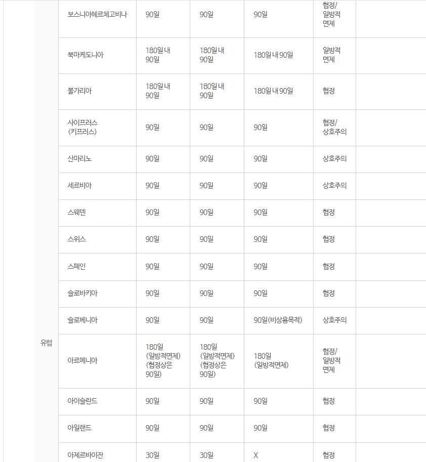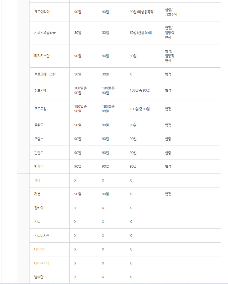 또 비자가 필요 없어도 비자 없이 머물 수 있는 기간이 국가별로 차이가 있습니다.