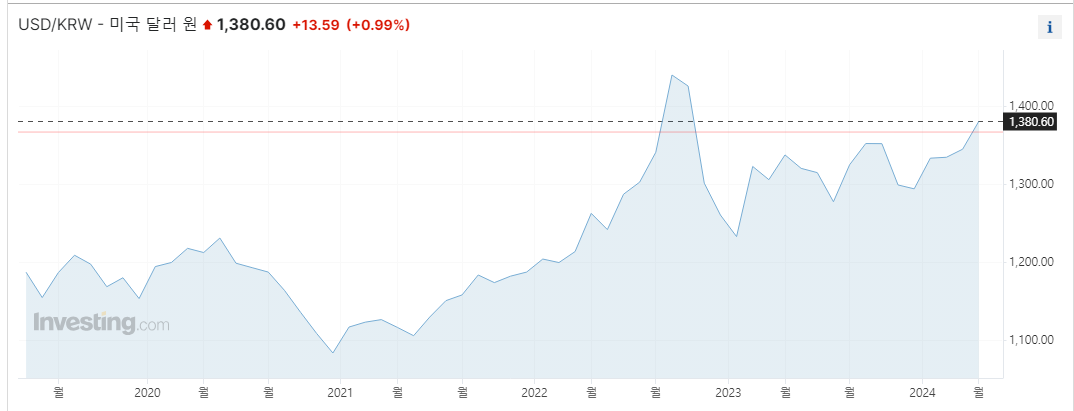 이는 2022년 10월 이후로 최고치의 달한 것으로 그간 환율은 1,220원까지 떨어졌다가 점점 몰라 최근 환율이 점점 불안정한 모습을 보이고 있다.
