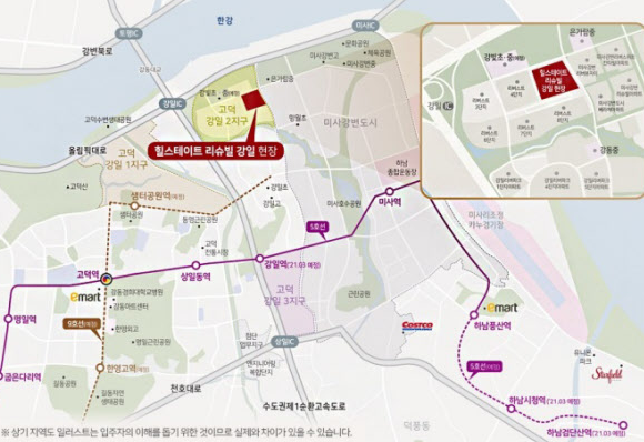 위치는 강일고덕1지구와 미사강변도시 사이에 있어 서울 외곽이긴 하지만, 강동구 쪽에서도 한강 쪽에 위치해 입지는 나쁘지 않다.