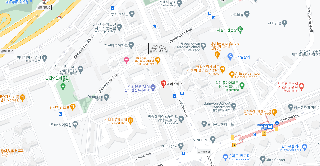 위치는 도보로 올 경우 반포역 4번 출구로 나오면 가깝다. 차를 가져올 경우 킴스클럽에 대고 차 번호를 이야기하면 되니 편하다. 온 김에 간단히 킴스클럽에서 필요한 것을 사고, 간단히 김밥을 사가는 것도 좋을 듯하다.