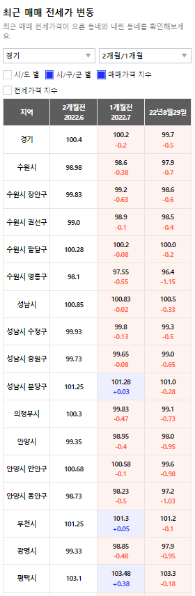 세부적으로 보면 수원시는 7월 -0.38%, 8월 0.7%나 빠졌는데, 그 중에서도 수원시 영통구는 7월 -0.55%, 8월 1.15%로 가장 많이 하락했다.