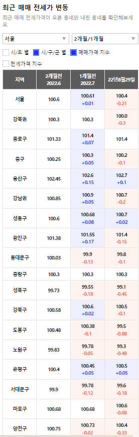 구별로 보면 강남권은 강남구가 7월 +0.32 상승했다가 8월 -0.05% 소폭 하락했다. 서초구는 7월 +0.15, 8월 보합세를 보이며 아직 하락폭이 거의 없는 상태다. 송파구는 7월 -0.13%, 8월 -0.4%로 계속 하락 중이다.