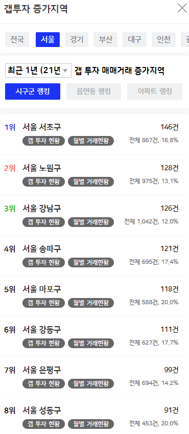 8위 권 내에서 건수가 가장 많았던 곳은 강남구다. 강남구는 1,042건으로 갭투자가 가장 활발한 곳이었으며, 2위는 975건을 기록한 노원구, 3위는 867건을 기록한 서초구였다.