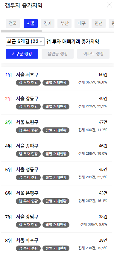 최근 6개월 사이 갭투자 건수를 기준으로 보면 일단 1위는 서초구, 2위는 강동구, 3위는 노원구, 4위는 송파구, 5위는 성동구로 강남구와 마포구가 상위권에서 밀려나 있는 것을 볼 수 있다. 최근 급상승한 지역에 여전히 갭투자 거래가 집중되어 있다.