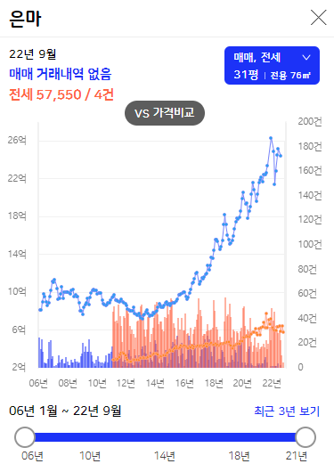 반포 대장 아파트인 래미안퍼스티지를 보자. 2011년 16억을 넘겼던 래미안퍼스티지 국평은 2013년을 전후로 12억대까지 빠졌다. 약 25%가 빠진 것으로 강남쪽보다는 하락폭이 상대적으로 적었다. 대략 2016년 전후로 전고점을 회복했으며, 이후 급상승해서 최근 약 38억까지 거래되었다. 대치동 은마와 타팰에 비해 하락폭도 적었고, 반등폭도 더 컸던 것을 알 수 있다. (역시 부동산은 어디에 투자하느냐에 따라 미래가 달라지는 듯...)