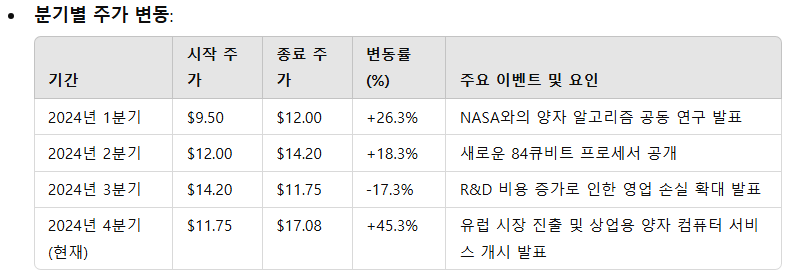 - 흑자 전환은 2027년으로 예상되며, 이는 양자 컴퓨팅 솔루션 판매와 구독 서비스 확장에 따른 것입니다.