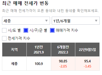 매매와 전세가 변동을 1년 전과 비교하면 그 차이가 더욱 크게 느껴진다. 1년 전 세종시 아파트 평균 가격은 큰 폭으로 하락했다. 2022년 3월 당시 매매 가격을 2021년 9월달과 비교하면 -2.05가 하락했으며, 9월 5일 기준 매매 가격을 1년 전과 비교하면 무려 -3.45나 하락했다.