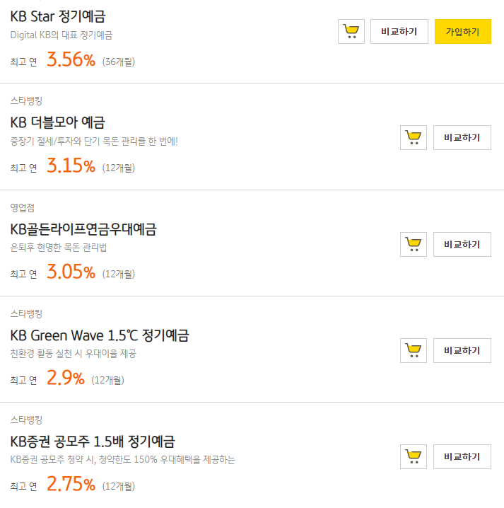 반면 국민은행 예금 금리는 우리은행보다 살짝 낮다. 스타정기에금은 3.56%, 더블모아는 3.15%를 주기 때문에 다른 은행 상품보다 매력이 떨어진다.