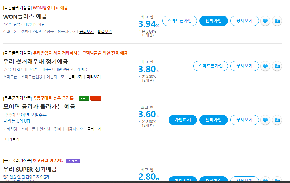네이버에서 최신 자료를 반영하지 못해 각 은행별 상품도 살펴보기로 한다. 우리은행의 경우 WON플러스 예금 상품은 최고 3.94%의 이율을 부여하니, 손품을 팔아 각 은행의 이율을 비교한 뒤 가입하는 것이 좋겠다.