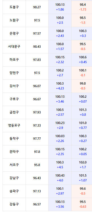 지난 1년 간 종로구도 4.67로 계속 상승했으며, 핫한 지역인 성동구도 2.37, 광진구는 3.17, 중랑구 3.2, 마포구 2.77, 구로구 3.53, 영등포구, 3.67, 금천구 3.37 등의 상승폭을 보였다.