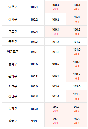 하지만 외곽 지역은 사정이 다르다. 일명 20-30대의 영끌 투자가 이어졌던 노도강의 사례를 보자. 노원주는 1주 전 -0.5, 2주 전에는 -0.3이 하락했으며, 도봉구는 1주 전 -0.8, 2주 전에는 -0.3, 강북구는 1주 전 -0.3, 2주 전에는 보합 수준이었다.