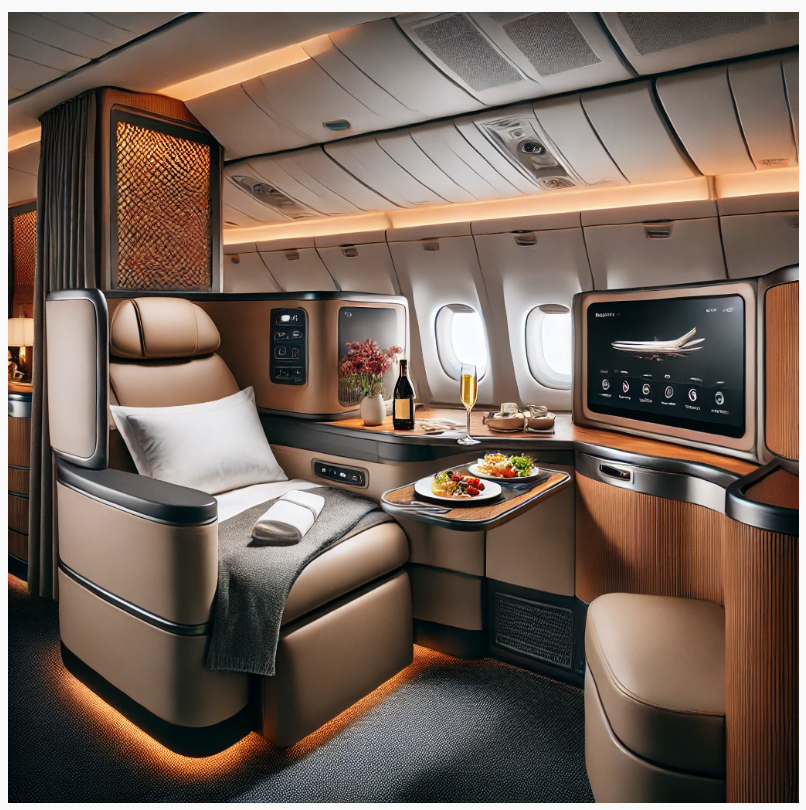- 개인 스위트룸 스타일 좌석: 최신형 항공기의 일등석은 개별 문이 달려 있는 프라이빗 스위트 형태로 제공되어 독립적인 공간을 확보할 수 있음.