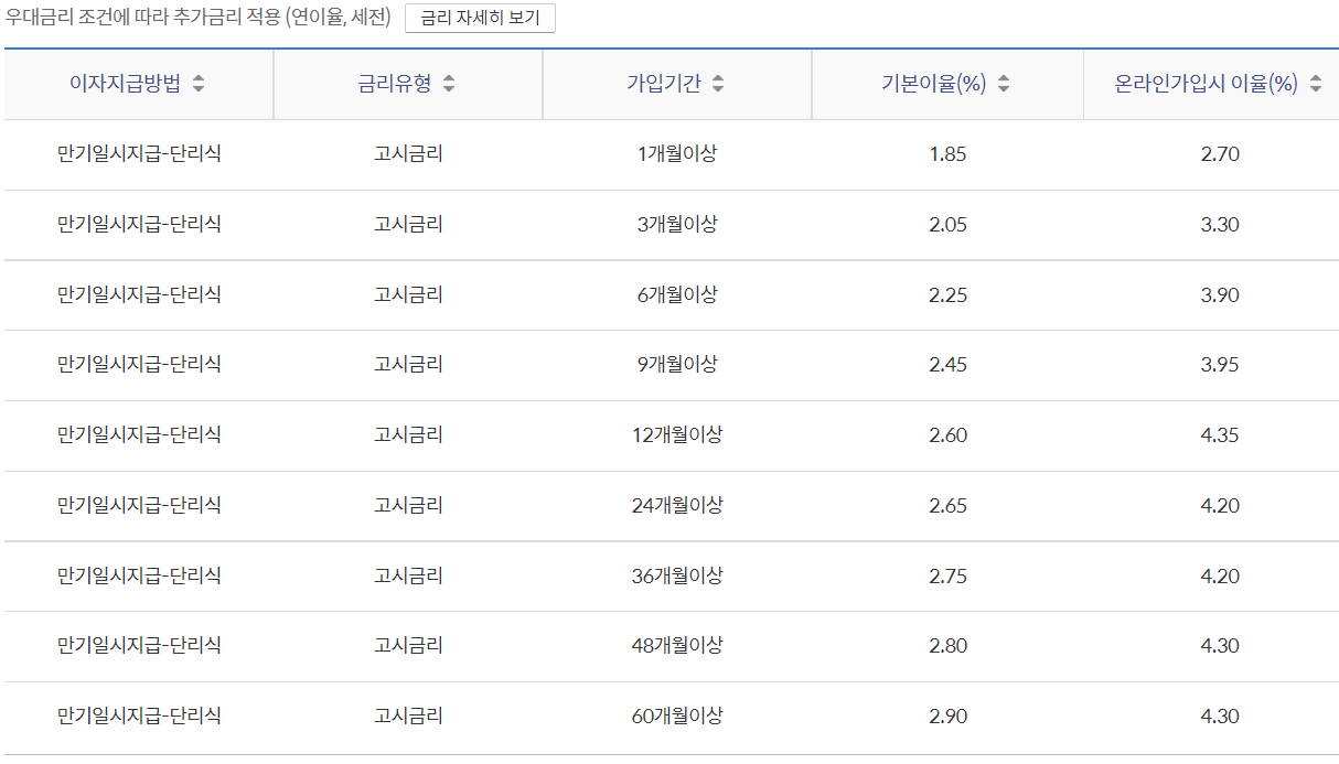 주의할 점은 각 은행 홈페이지에서 보여주는 정보는 1년 기준 금리라는 것이다 . 때문에 1~3개월 단기 금리도 별도로 확인해봐야 한다.