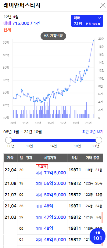 반래퍼 최대 평수인 72평도 올해 들어 최고가를 기록했다. 2022년 4월 71.5억을 기록하며(21층), 2021년 8월에 비해 무려 16.3억이나 올랐다. 현재 72평형은 74억(12층)이 최저가로 올라와 있으며, 최거가는 77.5억까지 올랐다.
