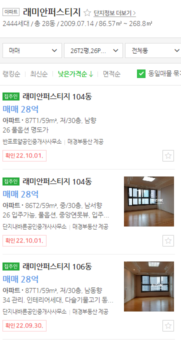가격이 상대적으로 조금 비싼 동쪽 단지를 보면 호가가 2021년 30억이라는 최고가를 기록한 뒤 약 5-7% 정도 소폭 가격이 조정된 물건이 나오고 있다. 저층은 27억도 있고, 중층도 28억 물건들이 나오고 있다.