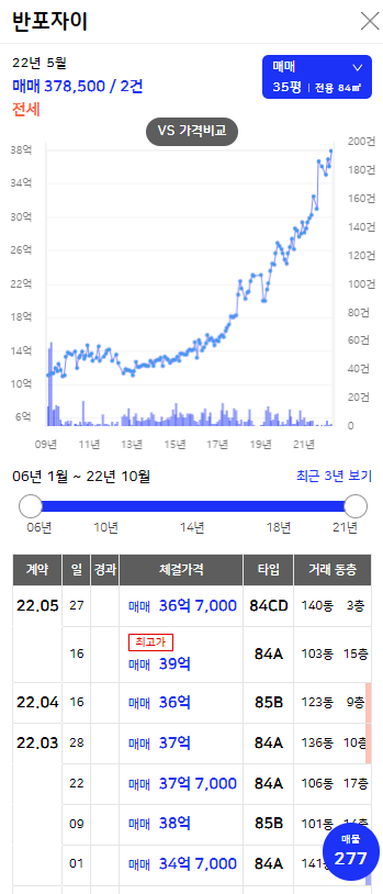 20평형은 아직 가격 하락의 조짐이 없지만, 35평형은 최근 다소 가격이 하락한 것이 보인다. 22년 5월, 39억(15층) 최고가를 기록하는 동시에, 36.7억으로 약7~8% 하락한 물건도 나왔다. 하지만 36.7억에 팔린 물건은 3층 저층이기 때문에 중간 층에 비해 최고 10%까지 낮을 수 있다는 점에서 급매라고 보기 어렵다.