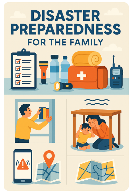 - 가족 대피장소 지정: 집 근처의 공원, 학교 운동장 등 넓고 안전한 공간