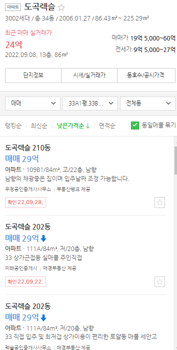 최근 동 평형 물건의 최저 호가는 29억이다. 고층과 저층이, 210동과 202동 등 다양한 동이 모두 29억에 나와 있는 것으로 보아 고점이었던 31.5억에 비해 약 8% 정도 조정된 가격에 매도 물건이 나와 있다고 할 수 있다.