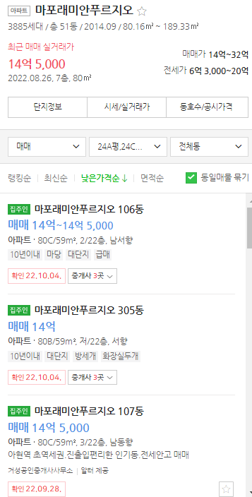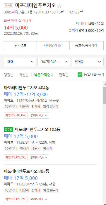그러나 최근 나오는 호가들을 보면 소폭 회복되었던 가격은 허상이었다. 현재 34평 국평 물건의 최저 호가는 17억이다. 저층 위주의 물건들이긴 하지만 22년 7월 18.4억에 거래되었던 것도 4층이었음을 감안하면 2달 사이에 1억 정도 더 시세가 하락한 것이라 할 수 있다. 이는 지난 최고가 대비 12% 이상 빠진 것으로 마용성으로 묶이며 강남3구에 필적하던 마포구 아파트들도 결국 하향세로 돌아선 것이라 할 수 있다.