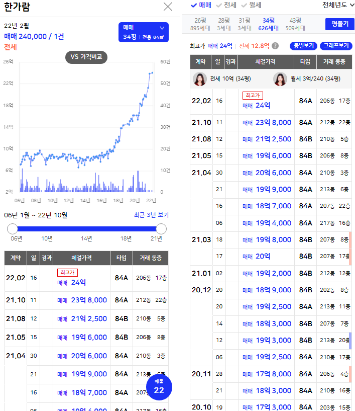 최근 호가도 큰 움직임은 없다. 다만 203동 고층 물건이 22억에 급매로 나와 있어, 이 가격을 기준으로 했을 때 약 4% 정도 살짝 내려간 것이라 할 수 있다. 하지만 급급매로 보이며, 이 물건 외에는 호가가 24억을 유지하고 있어 보합 수준을 유지하고 있다.