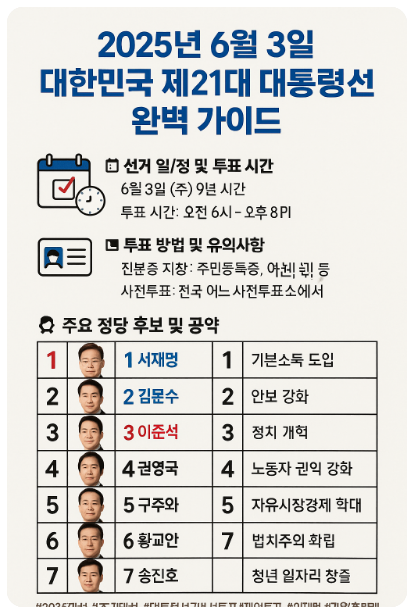 2025년 6월 3일, 대한민국은 제21대 대통령을 선출하는 조기 대선을 치릅니다. 이번 선거는 윤석열 전 대통령의 탄핵으로 인한 궐위로 조기 실시되며, 새로운 국가 리더십을 결정짓는 중요한 전환점이 될 것입니다.