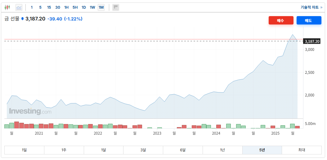 - 2025년 4월: 금값은 사상 최고치인 $3,500/온스를 기록한 후, 5월에는 $3,200 수준으로 하락.
