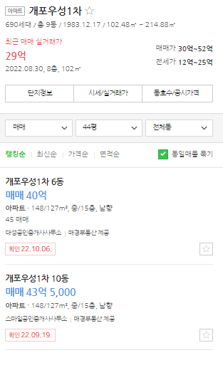최근 호가도 전혀 빠지지 않은 상황이다. 중층 물건이 40억에 나와 있으며, 그 외에는 43.5억으로 오히려 가격이 상승한 상황이다.